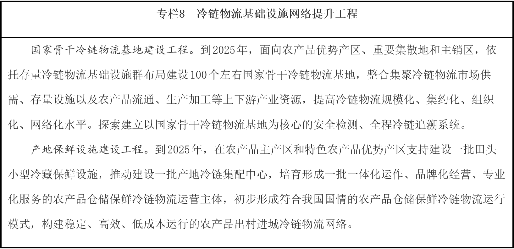 完善冷鏈物流設施網絡。發(fā)揮國家物流樞紐、國家骨干冷鏈物流基地的資源集聚優(yōu)勢,引導商貿流通、農產品加工等企業(yè)向樞紐、基地集聚或強化協(xié)同銜接。加強產銷冷鏈集配中心建設,提高產地農產品產后集散和商品化處理效率,完善銷地城市冷鏈物流系統(tǒng)。改善機場、港口、鐵路場站冷鏈物流配套條件,健全冷鏈集疏運網絡。加快實施產地保鮮設施建設工程,推進田頭小型冷藏保鮮設施等建設,加強產地預冷、倉儲保鮮、移動冷庫等產地冷鏈物流設施建設,引導商貿流通企業(yè)改善末端冷鏈設施裝備條件,提高城鄉(xiāng)冷鏈設施網絡覆蓋水平。