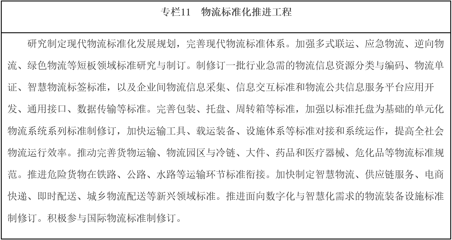 ——現代物流發(fā)展制度環(huán)境更加完善。物流標準規(guī)范體系進一步健全,標準化、集裝化、單元化物流裝載器具和包裝基礎模數廣泛應用。社會物流統(tǒng)計體系、信用體系更加健全,營商環(huán)境持續(xù)優(yōu)化,行業(yè)協(xié)同治理體系不斷完善、治理能力顯著提升。