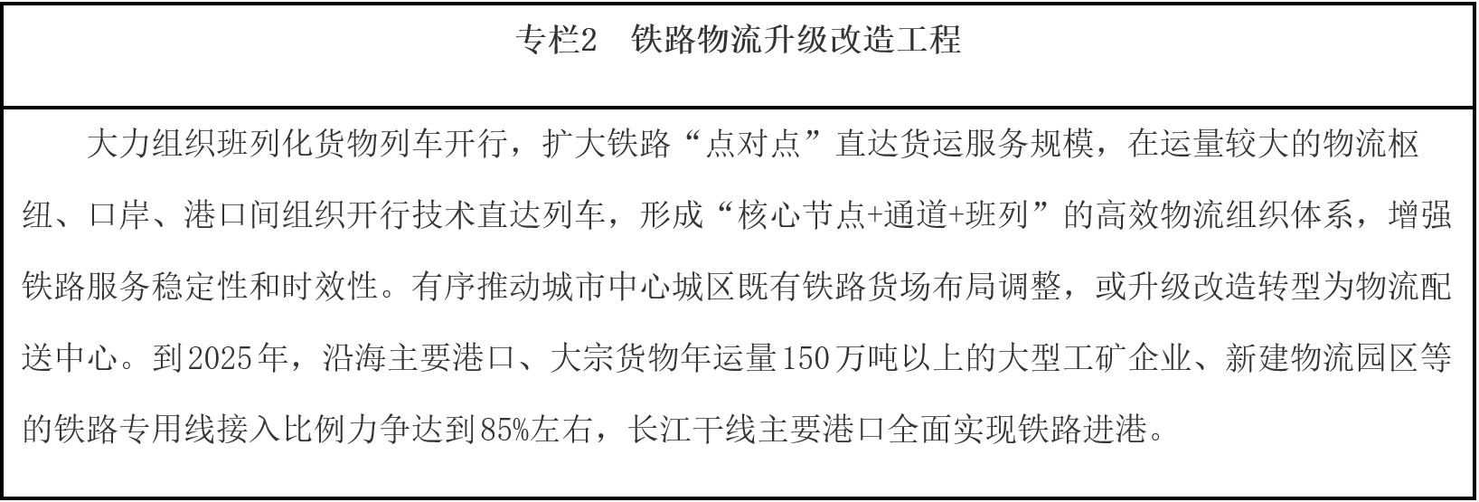 推進結構性降成本。加快推進鐵路專用線進港區(qū)、連園區(qū)、接廠區(qū),合理有序推進大宗商品等中長距離運輸“公轉鐵”、“公轉水”。完善集裝箱公鐵聯運銜接設施,鼓勵發(fā)展集拼集運、模塊化運輸、“散改集”等組織模式,發(fā)揮鐵路干線運輸成本低和公路網絡靈活優(yōu)勢,培育有競爭力的“門到門”公鐵聯運服務模式,降低公鐵聯運全程物流成本。統(tǒng)籌沿海港口綜合利用,提升大型港口基礎設施服務能力,提高碼頭現代化專業(yè)化規(guī)?;剑涌焱七M鐵水聯運銜接場站改造,提高港口鐵路專用線集疏網絡效能,優(yōu)化作業(yè)流程。完善內河水運網絡,統(tǒng)籌江海直達、江海聯運發(fā)展,發(fā)揮近海航線、長江水道、珠江水道等水運效能,穩(wěn)步推進貨物運輸“公轉水”。推進鐵水聯運業(yè)務單證電子化,促進鐵路、港口信息互聯,實現鐵路現車、裝卸車、貨物在途、到達預確報以及港口裝卸、貨物堆存、船舶進出港、船期艙位預定等鐵水聯運信息交換共享。支持港口、鐵路場站加快完善集疏運油氣管網,有效對接石化等產業(yè)布局,提高管道運輸比例。