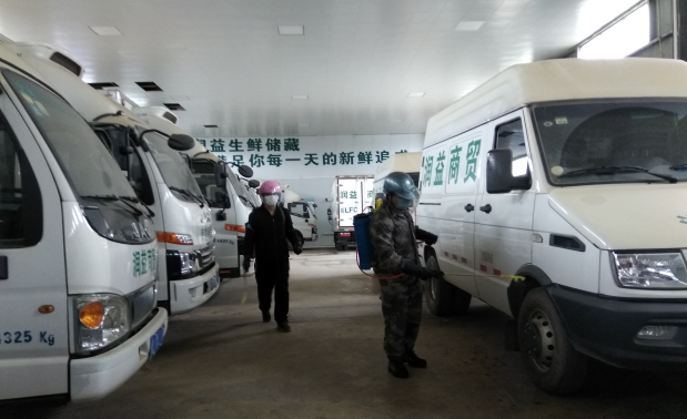 潤(rùn)益商貿(mào)公司工作人員正在消毒配送車輛?