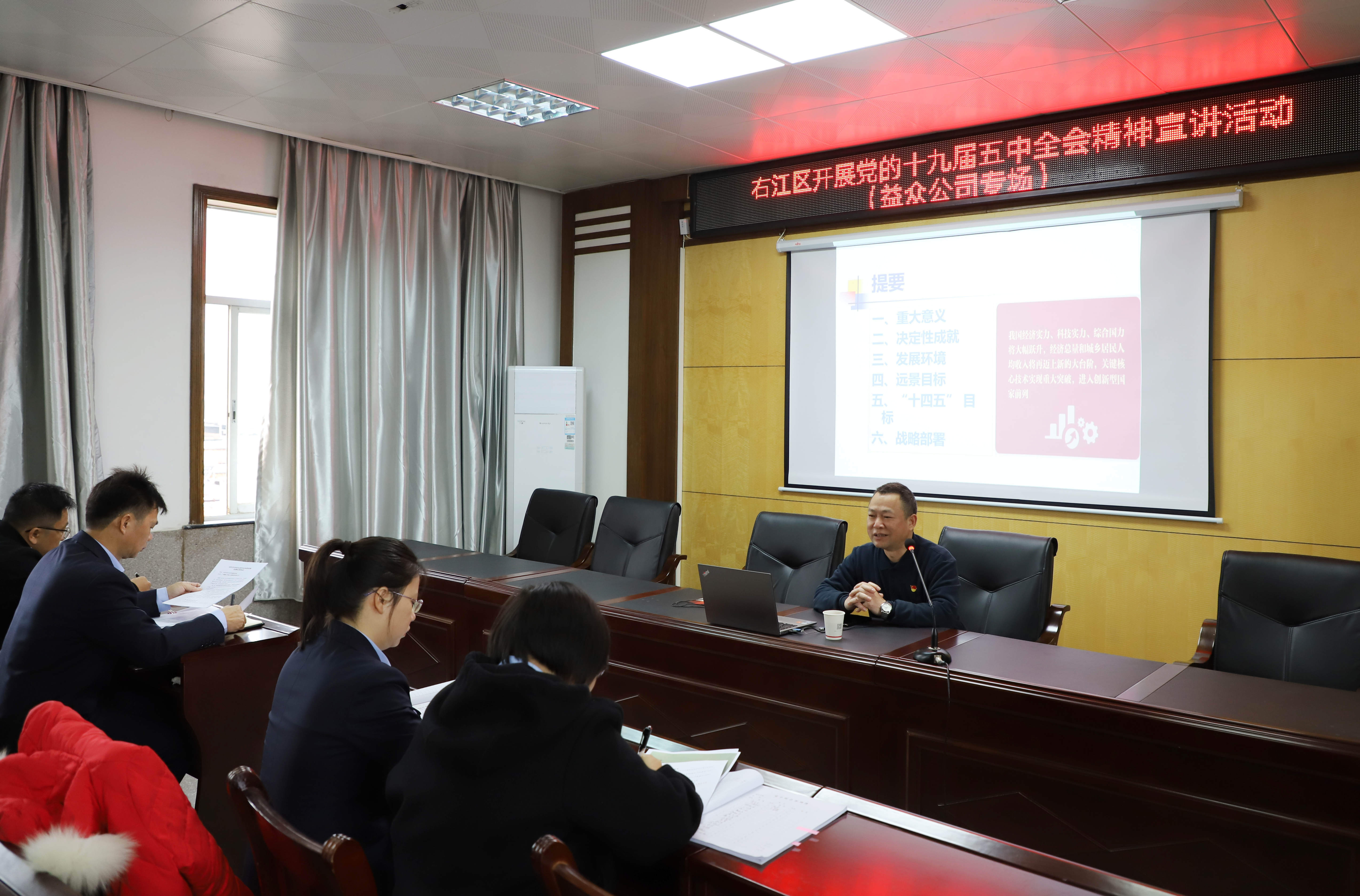 ????????右江區(qū)宣講團(tuán)黨的十九屆五中全會(huì)精神宣講報(bào)告會(huì)益眾公司專場(chǎng)近日舉行,宣講團(tuán)成員、區(qū)委黨校講師易祖文作宣講報(bào)告。公司領(lǐng)導(dǎo)干部、黨員、入黨積極分子約30人聆聽(tīng)報(bào)告。