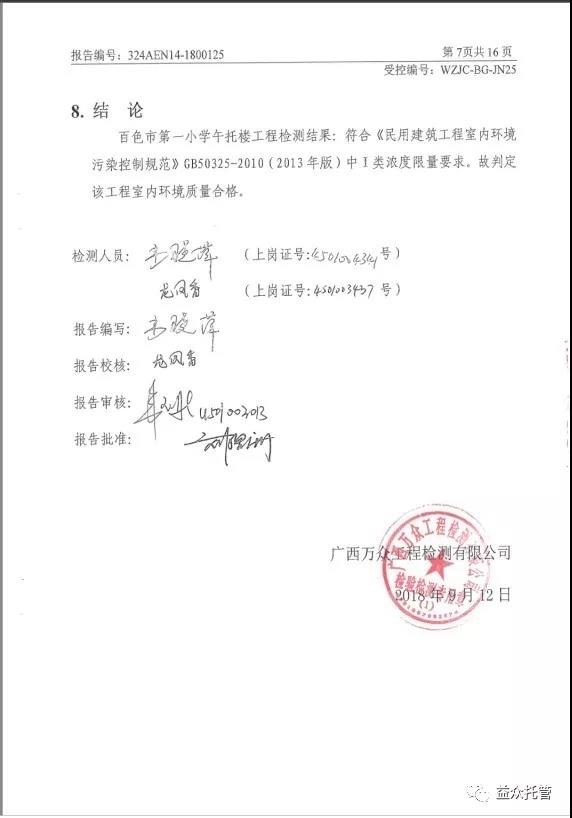 2??018年9月27日,廣西萬眾工程檢測有限公司提交了檢測報告,新托管樓室內、室外檢測點甲醛、氨、苯、TVOC、氡濃度指標均符合《民用建筑工程室內環(huán)境污染控制規(guī)范》GB50325-2010(2013年版)中I類濃度限量要求,室內環(huán)境質量合格。