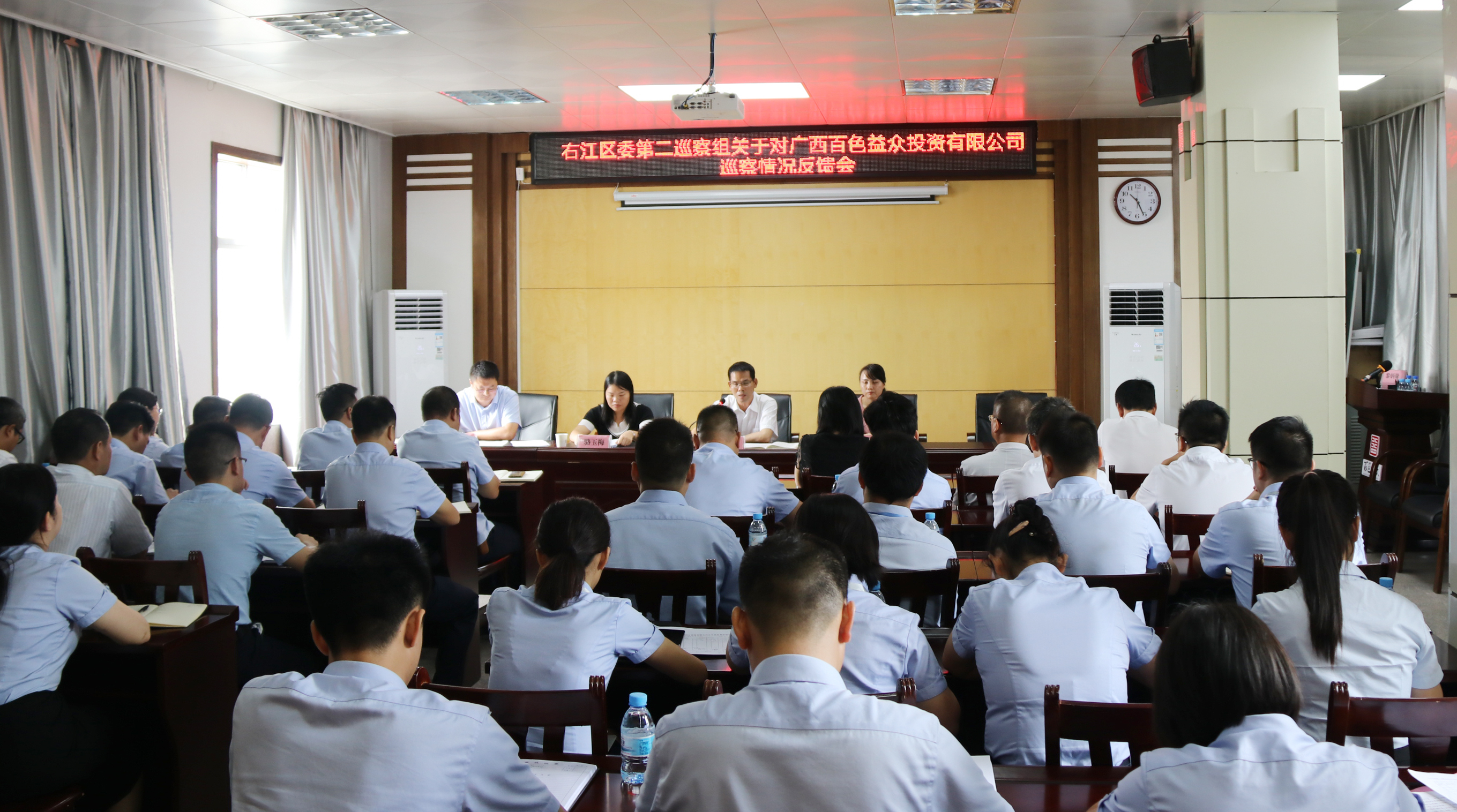 ???????9月17日上午,右江區(qū)委第二巡察組對廣西百色益眾投資有限公司巡察情況反饋會議在益眾公司辦公樓7樓會議室召開。區(qū)委第二巡察組組長黃梅艷在會上反饋巡察意見,益眾公司總經理趙家臣主持會議并作表態(tài)發(fā)言。