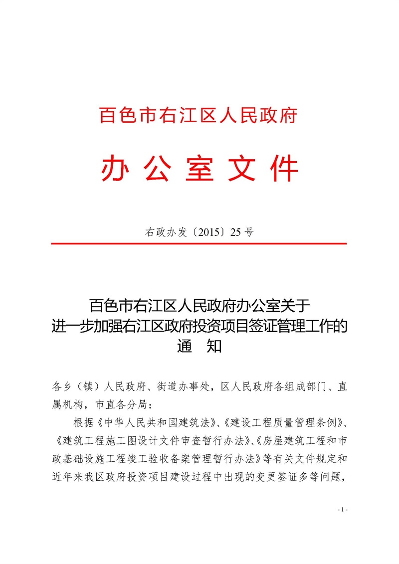 右政辦發(fā)[2015]25號(hào) 關(guān)于進(jìn)一步加強(qiáng)右江區(qū)政府投資項(xiàng)目簽證管理工作的通知