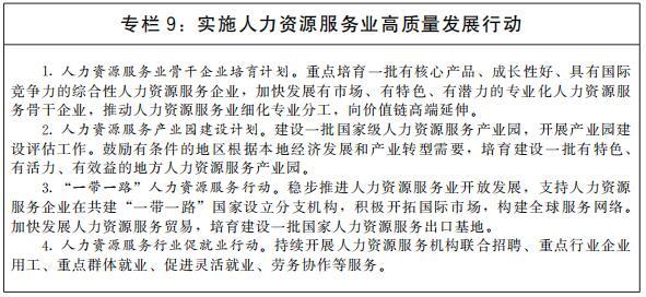 加快人力資源服務業(yè)高質量發(fā)展。推動人力資源服務與實體經濟融合發(fā)展,引導人力資源服務機構圍繞產業(yè)基礎高級化、產業(yè)鏈現(xiàn)代化提供精準專業(yè)服務。鼓勵人力資源服務業(yè)管理創(chuàng)新、技術創(chuàng)新、服務創(chuàng)新和產品創(chuàng)新,大力發(fā)展人力資源管理咨詢、高級人才尋訪、人才測評等高技術、高附加值業(yè)態(tài)。實施人力資源服務業(yè)領軍人才培養(yǎng)計劃。開展“互聯(lián)網+人力資源服務”行動。深化人力資源服務領域對外開放,探索建設國家人力資源服務出口基地。