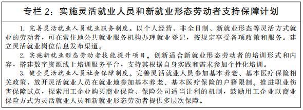 支持多渠道靈活就業(yè)和新就業(yè)形態(tài)發(fā)展。破除各種不合理限制,建立促進多渠道靈活就業(yè)機制,支持和規(guī)范發(fā)展新就業(yè)形態(tài)。鼓勵傳統(tǒng)行業(yè)跨界融合、業(yè)態(tài)創(chuàng)新,增加靈活就業(yè)和新就業(yè)形態(tài)就業(yè)機會。加快落實《關于維護新就業(yè)形態(tài)勞動者勞動保障權益的指導意見》,建立完善適應靈活就業(yè)和新就業(yè)形態(tài)的勞動權益保障制度,引導支持靈活就業(yè)人員和新就業(yè)形態(tài)勞動者參加社會保險,提高靈活就業(yè)人員和新就業(yè)形態(tài)勞動者社會保障水平。規(guī)范平臺企業(yè)用工,明確平臺企業(yè)勞動保護責任。健全職業(yè)分類動態(tài)調整機制,持續(xù)開發(fā)新職業(yè),發(fā)布新職業(yè)標準。