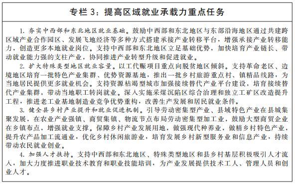 推動區(qū)域就業(yè)協(xié)調發(fā)展。支持東部地區(qū)發(fā)揮創(chuàng)新要素集聚優(yōu)勢,率先實現(xiàn)產業(yè)升級,開拓高質量就業(yè)新領域,培育高質量就業(yè)增長極。加快完善中西部和東北地區(qū)基礎設施,提升產業(yè)集聚區(qū)公共服務效能,引導產業(yè)向中西部和東北地區(qū)有序梯度轉移,推動就業(yè)機會向中西部和東北地區(qū)擴散。支持中西部和東北地區(qū)根據(jù)國家戰(zhàn)略導向和發(fā)展重點,對接先進生產要素和創(chuàng)新資源,發(fā)展特色優(yōu)勢產業(yè),改造提升傳統(tǒng)產業(yè),積極布局新興產業(yè),厚植就業(yè)創(chuàng)業(yè)沃土。