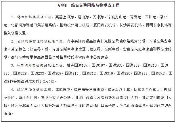 建設(shè)多節(jié)點(diǎn)、網(wǎng)格狀、全覆蓋的京津冀一體化綜合交通網(wǎng)絡(luò),基本建成軌道上的京津冀,高標(biāo)準(zhǔn)、高質(zhì)量打造雄安新區(qū)對外交通網(wǎng)絡(luò),加強(qiáng)北京城市副中心與中心城區(qū)、廊坊北三縣交通基礎(chǔ)設(shè)施互聯(lián)互通,強(qiáng)化北京冬奧會、冬殘奧會交通保障。依托長江黃金水道,整體設(shè)計(jì)推進(jìn)長江經(jīng)濟(jì)帶綜合交通運(yùn)輸體系建設(shè),補(bǔ)強(qiáng)沿江高鐵和鐵路貨運(yùn)能力,全力打通公路省際待貫通路段,提升江海聯(lián)運(yùn)、鐵水聯(lián)運(yùn)發(fā)展水平。推進(jìn)粵港澳大灣區(qū)基礎(chǔ)設(shè)施互聯(lián)互通,優(yōu)化航運(yùn)和航空資源配置,加強(qiáng)港澳與內(nèi)地的交通聯(lián)系,支持香港提升國際航運(yùn)、國際航空樞紐地位。推動長三角地區(qū)交通運(yùn)輸更高質(zhì)量一體化發(fā)展,加快對外交通、城際交通、都市圈交通高效銜接和有機(jī)融合,協(xié)同推進(jìn)港航、海事一體化發(fā)展,推動上海市、江蘇省、浙江省、安徽省共建輻射全球的航運(yùn)樞紐,加快提升江蘇通州灣江海聯(lián)動示范區(qū)功能,打造長江集裝箱運(yùn)輸新出???。構(gòu)建海南島內(nèi)暢通、陸島連通、全球通達(dá)的現(xiàn)代綜合交通運(yùn)輸體系,建設(shè)現(xiàn)代化綜合交通樞紐,穩(wěn)步推進(jìn)自由貿(mào)易港建設(shè)。構(gòu)建黃河流域綠色安全便捷綜合交通網(wǎng)絡(luò),強(qiáng)化跨區(qū)域大通道建設(shè)。