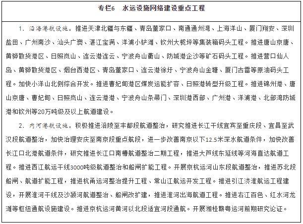 優(yōu)化暢通水運(yùn)設(shè)施網(wǎng)絡(luò)。建設(shè)京津冀、長三角、粵港澳大灣區(qū)世界級港口群,支持山東打造世界一流的海洋港口,推進(jìn)東北地區(qū)沿海港口一體化發(fā)展,優(yōu)化港口功能布局,推動資源整合和共享共用。有序推進(jìn)沿海港口專業(yè)化碼頭及進(jìn)出港航道等公共設(shè)施建設(shè)。適度超前建設(shè)糧食、能源、礦產(chǎn)資源的接卸、儲存、中轉(zhuǎn)設(shè)施,推進(jìn)沿海沿江液化天然氣碼頭規(guī)劃建設(shè)。提升內(nèi)河港口專業(yè)化、規(guī)模化水平,合理集中布局集裝箱、煤炭、鐵礦石、商品汽車等專業(yè)化碼頭。加強(qiáng)內(nèi)河高等級航道擴(kuò)能升級與暢通攻堅(jiān)建設(shè),完善長江、珠江、京杭運(yùn)河和淮河等水系內(nèi)河高等級航道網(wǎng)絡(luò),進(jìn)一步提升珠三角高等級航道網(wǎng)出海能力,全面加強(qiáng)長三角、珠江—西江高等級航道網(wǎng)未達(dá)標(biāo)段建設(shè)。推動重要支流航道和庫湖區(qū)航道、內(nèi)河旅游航道、便民碼頭建設(shè)。